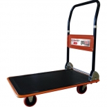 Structure et plateau renforcés en acier laqué avec revêtement antidérapant. Bande de protection et coins arrondis. Équipé de 4 roues Ø 100 mm à bandage caoutchouc dont 2 pivotantes.