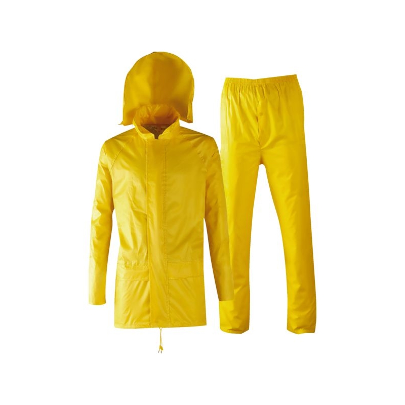 Polyester/PVC souple. Veste : capuche fixe et cordon de serrage, fermeture à glissière. Pantalon : serrage élastique à la taille. Coloris : bleu marine, jaune, vert Taille : M à 3XL