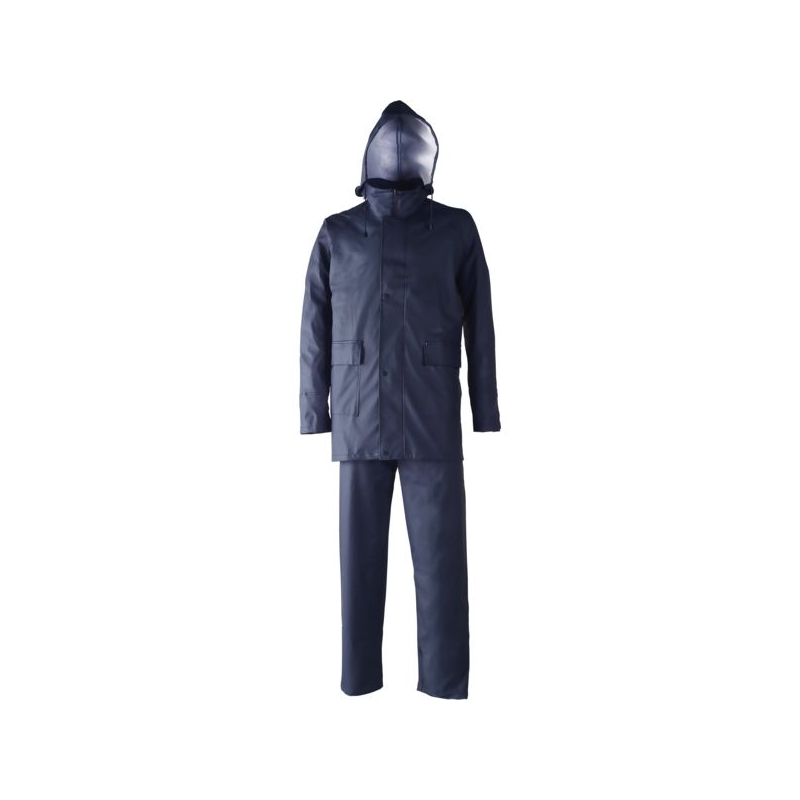 Veste : Capuche dans le col, fermeture à glissière sous rabat pressions, 2 poches latérales avec rabat, dos ventilé, serrage à la taille. Pantalon : Braguette et pression, cordon de serrage à la taille et serrage élastique, ajustement bas de jambes par pressions passe-mains. Coloris : bleu marine, jaune, vert Taille : M à 3XL Norme : CE Cat II - EN 343 (3.1)