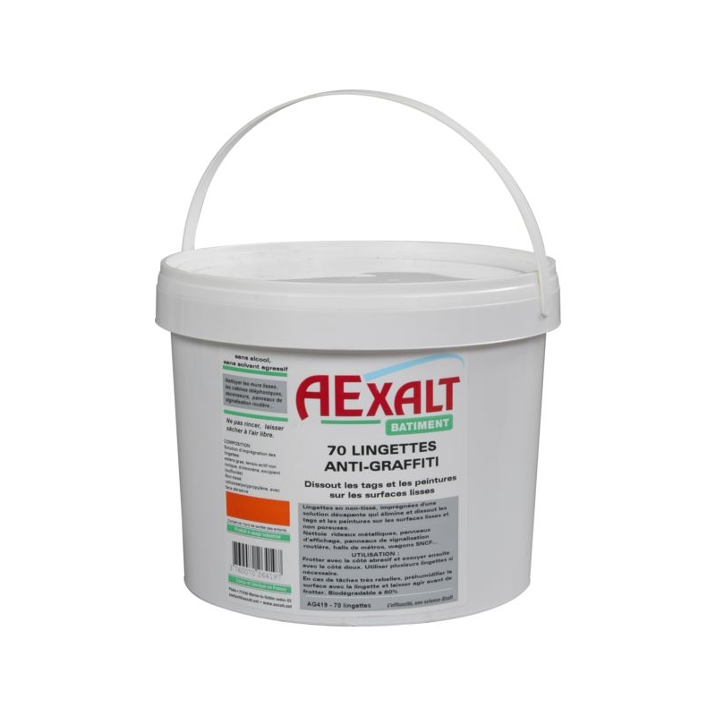 Imprégnées d'une solution décapante, qui élimine et dissout encres et peintures sur surfaces lisses non poreuses. Permet de traiter les ascenseurs, rideaux métalliques, panneaux de signalisation routière, wagons, métro. Idéales pour les services de nettoyage municipaux et industriels. Sans alcool, sans solvant agressif, convient pour les surfaces fragiles. Sans rinçage, sans résidu. Conditionnement : boîte de 75 lingettes