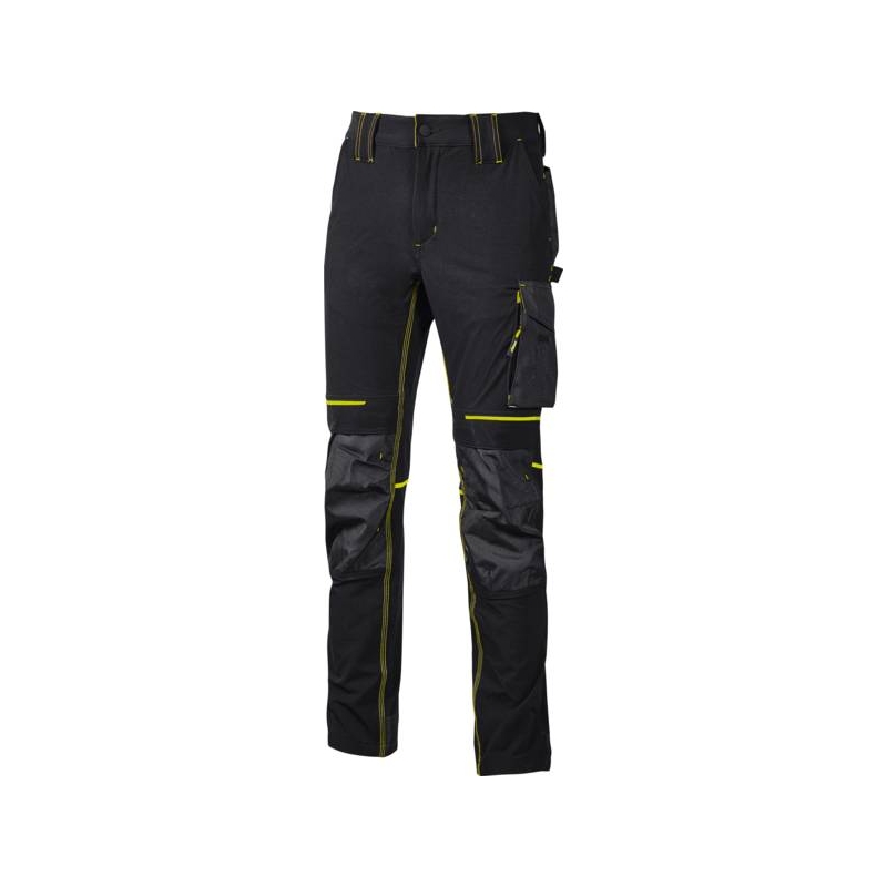 90% nylon 10% spandex, 260 gr/m2. Tissu stretch, doux au toucher, déperlant, respirant et au séchage rapide. Poche latérale porte-outils, poche latérale multifonction avec porte badge rétractable, 2 amples poches à l’arrière, 2 poches porte-genouillère à ouverture facile par le haut (réf 103541 à commander séparément), poches zippées cachées sous la grande poche latérale et sous la poche avant droite. Bas de pantalon entièrement renforcé en polyoxford 600D. Bavette à l’arrière pour une meilleure protection lombaire. Taille élastiquée avec un système innovant de serrage invisible. Coloris : noir/jaune, marine/orange Taille : M à 2XL