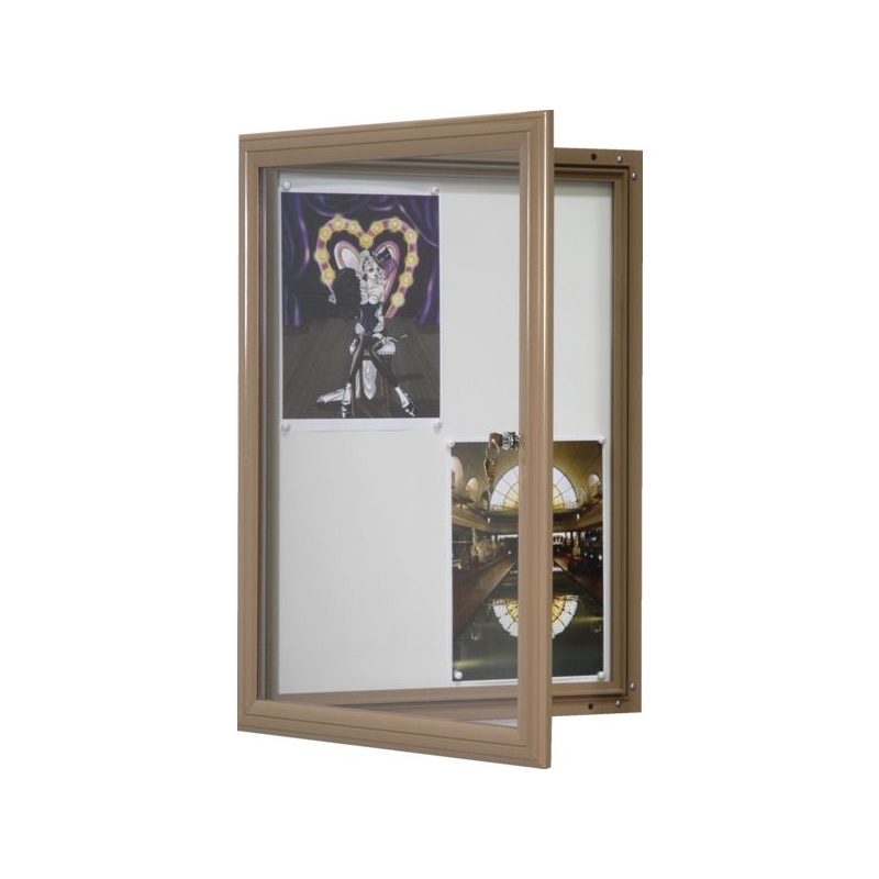 Vitrine réversible avec fond tôle laquée électrozinguée (affichage magnétique). Porte battante démontable avec charnière inox. Encadrement aluminium anodisé, façade verre Sécurit 4 mm. Fermeture par serrure dans le vitrage. Fixation murale 4 points. Épaisseur hors-tout : 35 mm Épaisseur utile : 21 mm Existe en noir, gris et rouge.