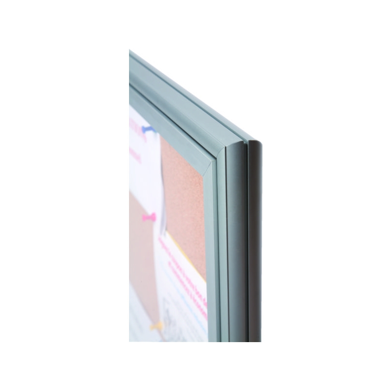 Porte battante démontable, encadrement aluminium et vitrage méthacrylate. Serrure à clé dans le vitrage. Fixation murale 4 points. Épaisseur hors-tout : 32 mm Épaisseur utile fond tôle/liège : 22/13 mm Version en verre Securit 4 mm d'épaisseur sur consultation.